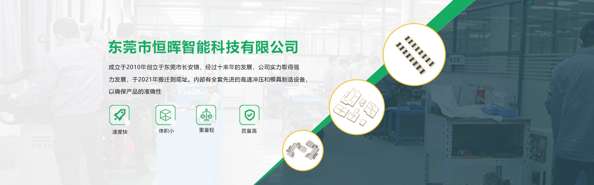 成立于2010年创立于东莞市长安镇,经过十来年的发展,公司实力取得强力发展,于2021年搬迁到现址。内部有全套先进的高速冲压和模具制造设备,以确保产品的准确性; 完善的环境管理机制和质量管理体系,确保产品质量,专业的技术团队以严谨的工作态度为客户提供优质的服务。